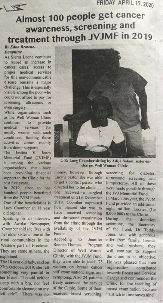 On March 16, 2020, representatives from the Board of the Jestina V. Jones Memorial Fund donated a checque for Le8 million to the Well Woman Clinic in Freetown, Sierra Leone. The presentation was covered by the press, including the AWOKO newspaper and SL Television. Present at the event were Chair of the Board, Dr. Ibi May-Parker; husband of the Late JV Jones, Dr. Teddy Jones; brother of Teddy Jones, Dr. Ulric Jones; Director of the Well Woman Clinic, Mrs. Jennifer Renner-Thomas; Head Sister Adijatu Uviegbisie, Sister Glena Kargbo; and Reproductive Health Consultant, Ms Tina Davies.